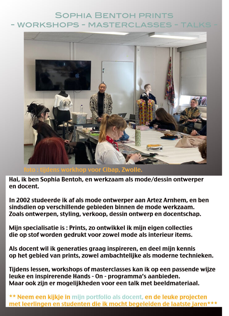 Sophia Bentoh is since 2001 active in different fields of the fashion industry. The first years as a freelance fashion designer, and later as a freelance stylist for a.o. Little Thing Magazine (China), in advertising for brands like Nike and Adidas or as a styling assistant for L’Officiel NL amongst others.