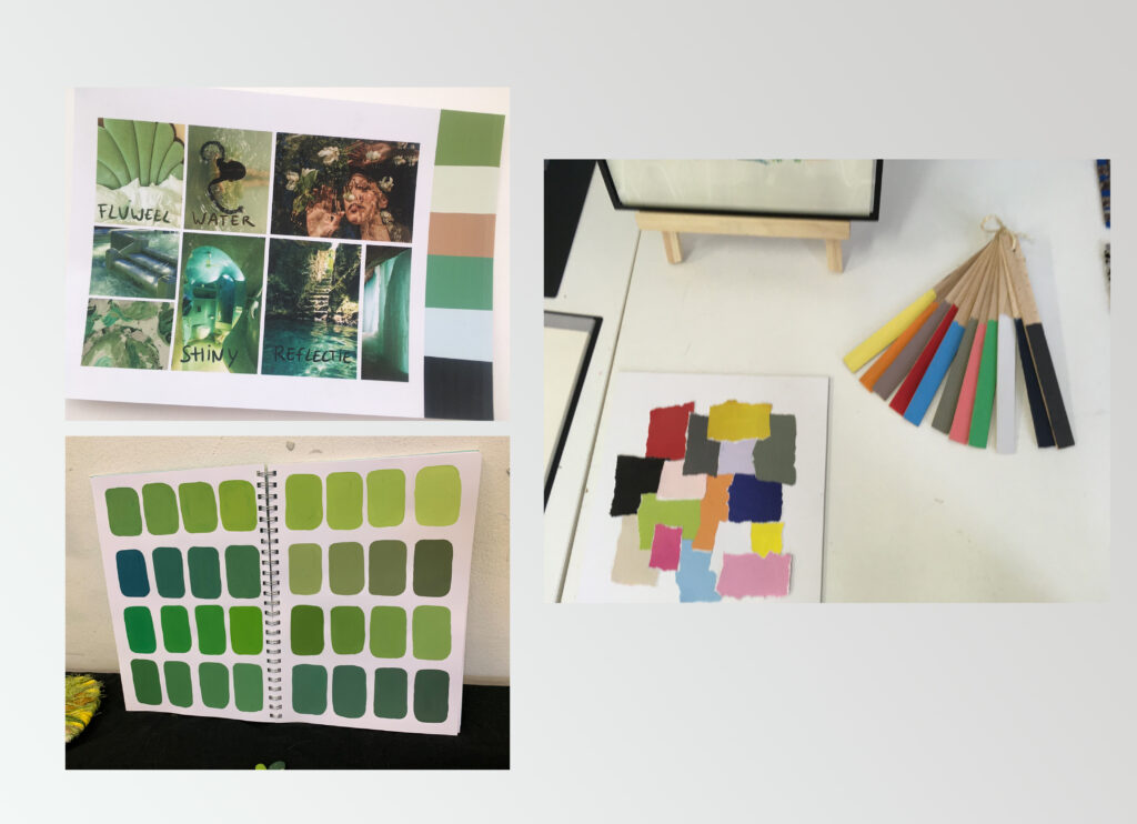 – Aandacht : welke kleuren komen duidelijk voor in jouw collage / moodboard ? > maak onderscheid tussen hoofdkleuren en accentkleuren en meng deze met verf, welke materialen zijn belangrijk?