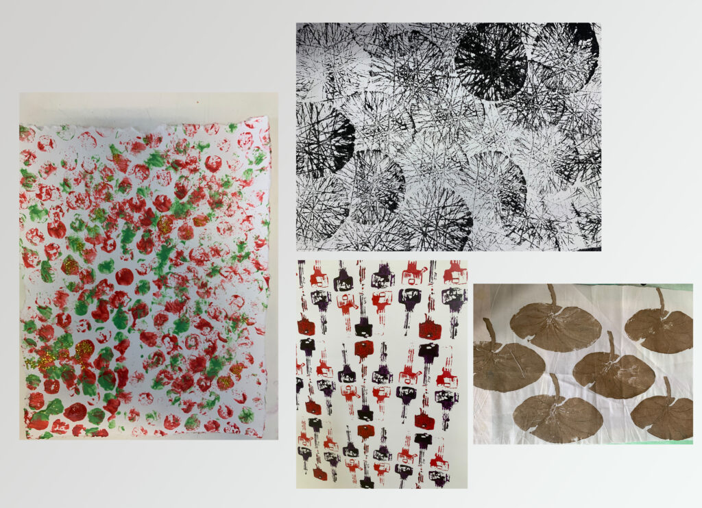 – Doel : maak een print op papier door te experimenteren met de ambachtelijke stempel print techniek en recycle materialen, herhaling, patroon, gelaagdheden en kleurgebruik.