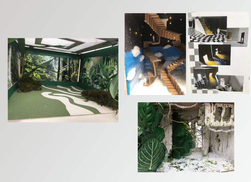 – Doel : het werken met schaal en proporties, hoe weet je een sfeer te ontwerpen met de materialen en kleuren, en daarmee een eigen wereld of interieur voorstelling te maken .